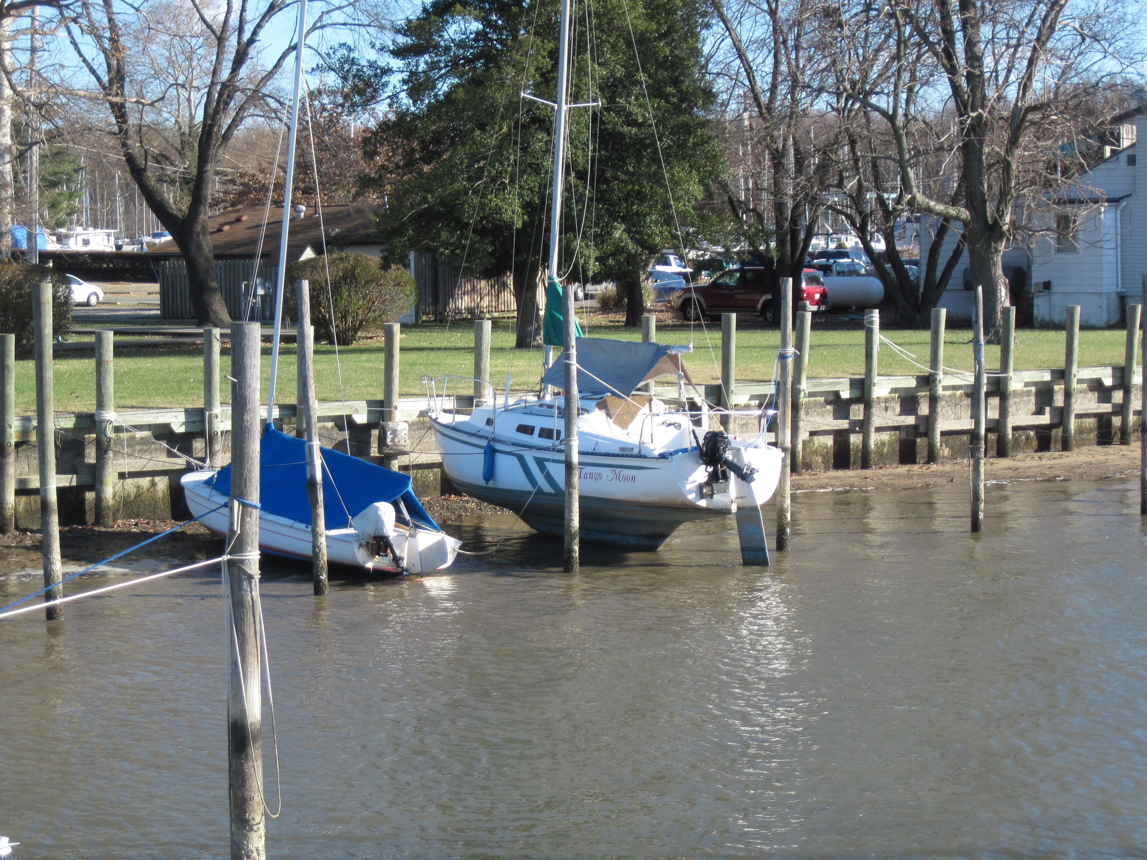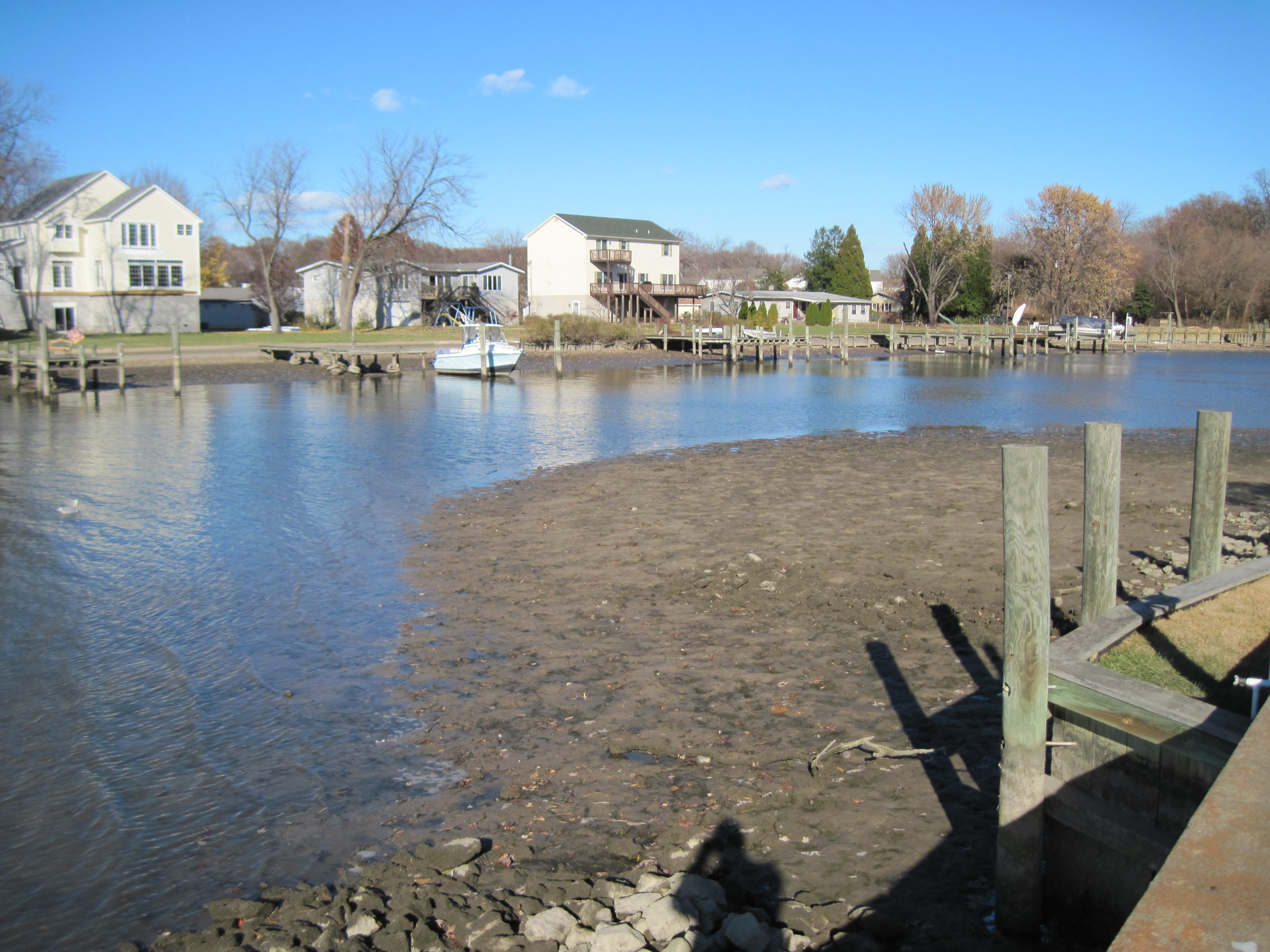 I went to the marina yesterday to do some work. It looks like a strong wind sucked most of the water out of the creek. I haven’t seen the water this low since Hurricane Sandy. The step from the finger pier onto the boat was far too big to do safely, so I left after grabbing a few photos…